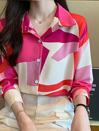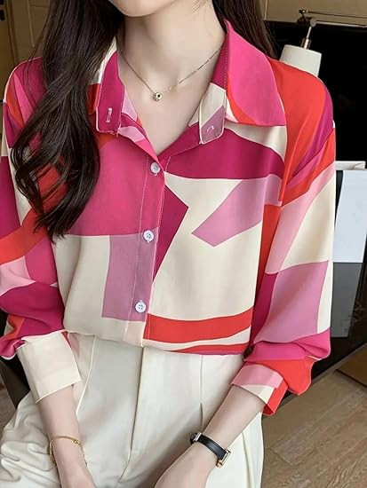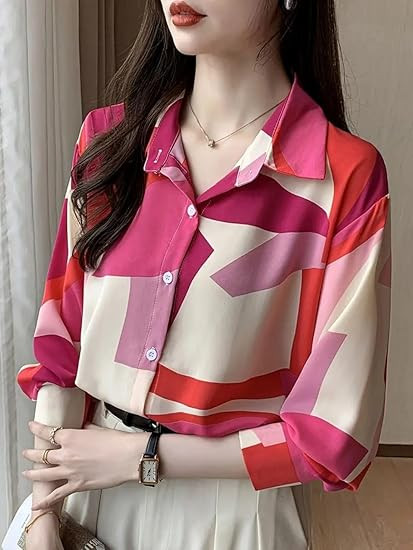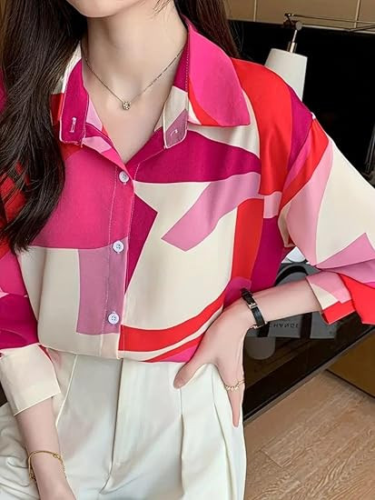 Trendy Korean Shirt for Women: This stylish white pink printed shirt with a spread collar and full sleeves offers a chic western wear vibe, perfect for casual outings or everyday wear. A must-have in women’s shirts latest fashion.