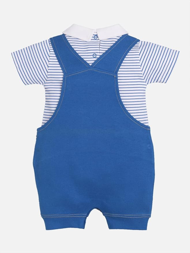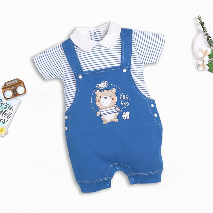 DESIGN: Newborn baby neutral clothes, baby boy dungaree, uses contrast color, round neck, short sleeve, bottom snap closure for easy diaper changing