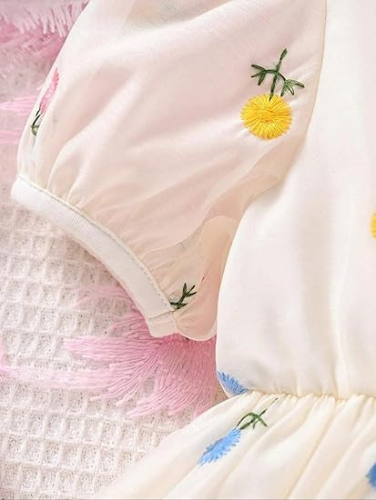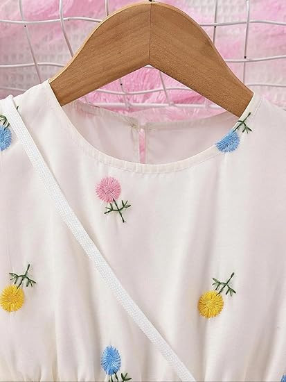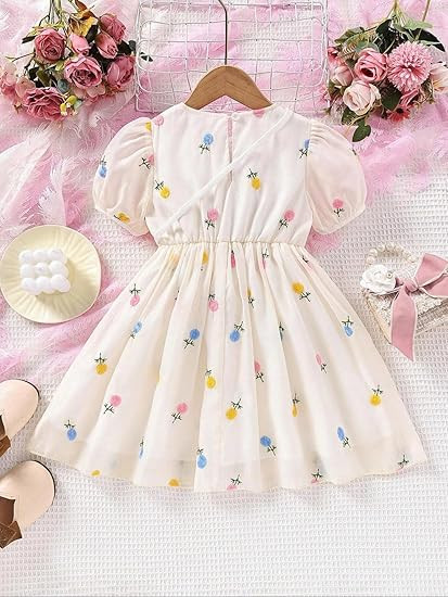 tyle Name : Puff Sleeve Round Neck Elastic Waist Dress Pattern: Swiss Dot with Digital Print, Details: Puff Sleeve Round Neck, Sleeve Length: Short Material Composition: Gorgette, Fabric : Non-Stretch