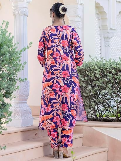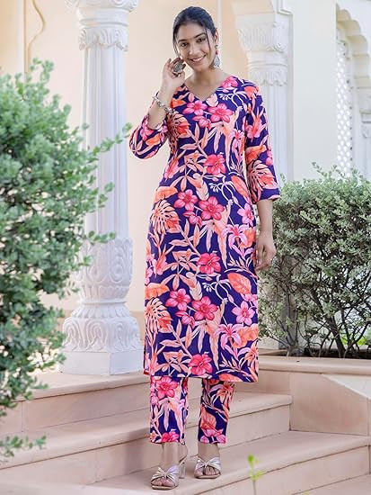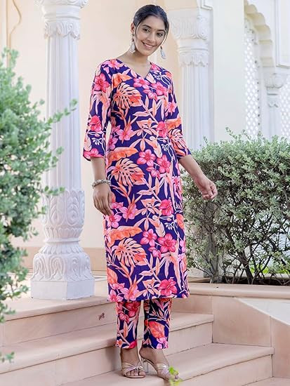 Material: Cotton Blend || Style Type: Straight || Length Type: Calf Length || Pattern: Printed || Neck Type: V-Neck || Sleeve Length: 3/4th Sleeve || Package Includes: 1 Top, 1 Pant Made from a soft cotton blend, this top and pant set is breathable and comfortable. You can enjoy wearing it all day without any discomfort, whether you're at home or out and about.