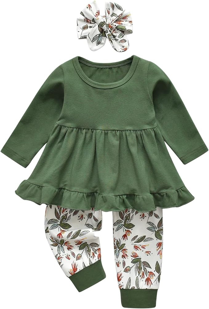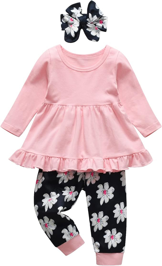 Design: Long sleeve cute ruffle and hi-lo irregular hem design, round neck solid color, elastic waist pant with leopard or floral prints, bowknot headband, cute and fashionable.