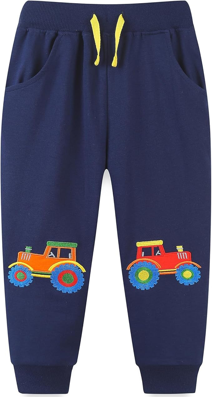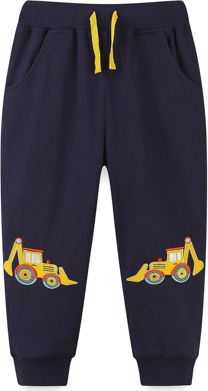 Featuring adorable embroidered designs of dinosaurs, rockets, and excavators, these pants are perfect for little boys who love adventurous themes.