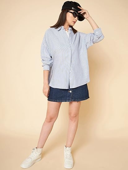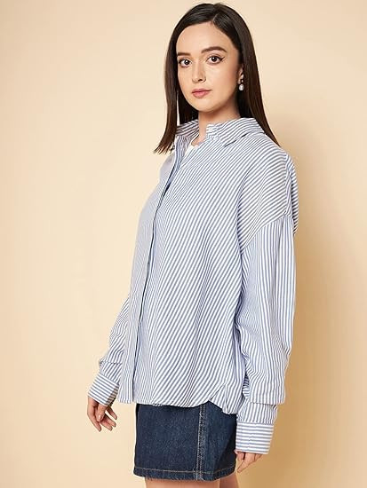 Women's striped oversized casual shirt is a comfortable and stylish piece of clothing that can be worn for different occasions. The shirt features a spread collar and long regular sleeves, providing a classic and timeless look.