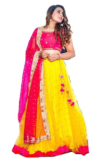 Net, Plain weave, Striped, Plain weave, Elastic, Embroidered, Semi-stitched Lehenga Choli Material: Net Color Name: Pink,yellow