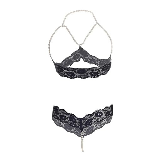 Women's Sexy Lace Pearl Design Front Open Bra and Thongs Panty Lingerie Set Free Size Black