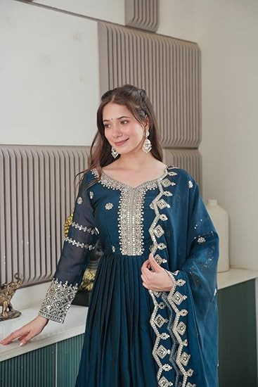 Women's Solid Embroidery Work Crush Silk Gown with Dupatta Long Sleeves and Round Neck Most Beautiful Havy Gown for Party |
