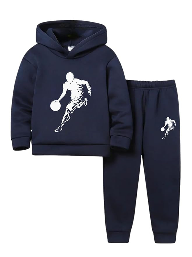Moving Basketball Player Silhouette Print Boy's 2pcs Comfy Hooded Sweatshirt & Pants Set, Perfect For Fall | Boy's Clothing Set